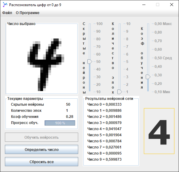Нейронная сеть, распознавание цифр от 0 до 9.